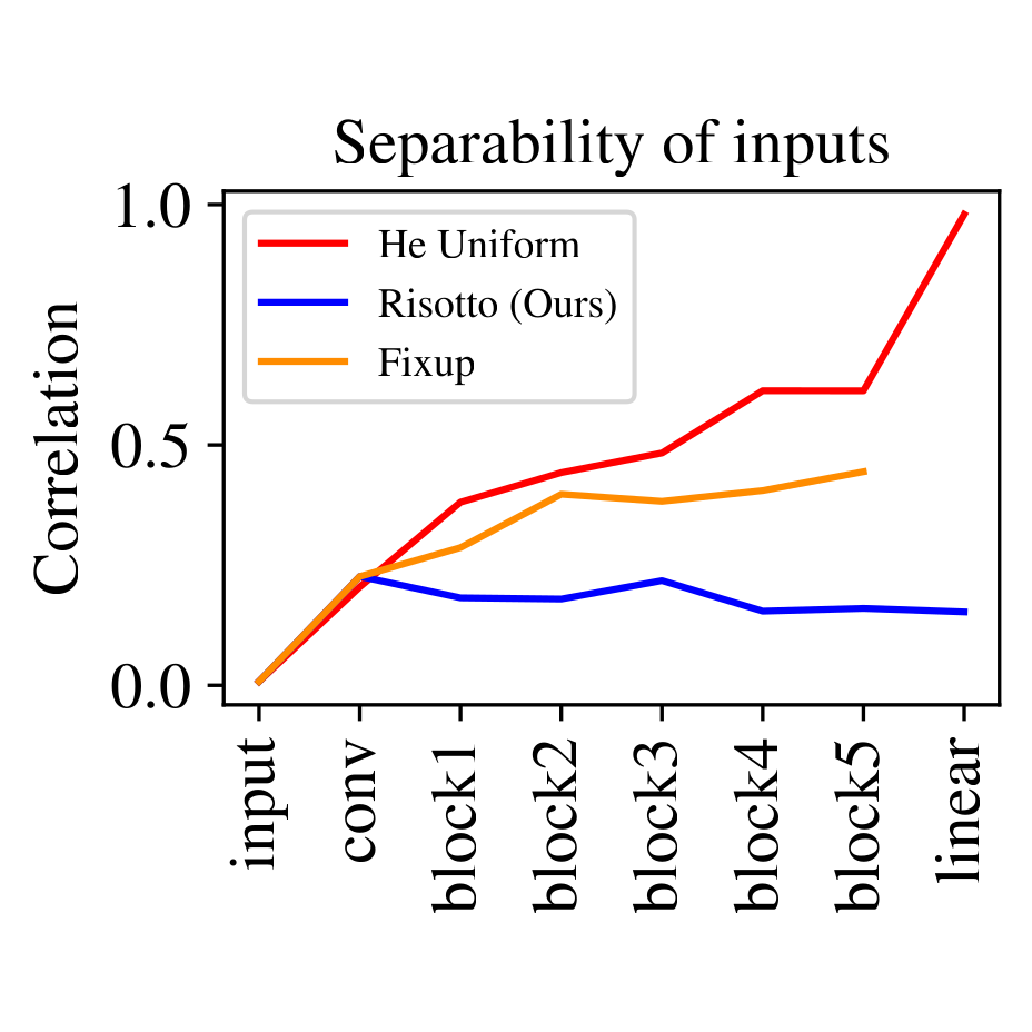 The training success, training speed and generalization ability of neural networks rely crucially on the choice of random parameter initialization. It has been shown for multiple architectures that initial dynamical isometry is particularly advantageous. Known initialization schemes for residual blocks, however, miss this property and suffer from degrading separability of different inputs for increasing depth and instability without Batch Normalization or lack feature diversity. We propose a random initialization scheme, RISOTTO, that achieves perfect dynamical isometry for residual networks with ReLU activation functions even for finite depth and width. It balances the contributions of the residual and skip branches unlike other schemes, which initially bias towards the skip connections. In experiments, we demonstrate that in most cases our approach outperforms initialization schemes proposed to make Batch Normalization obsolete, including Fixup and SkipInit, and facilitates stable training. Also in combination with Batch Normalization, we find that RISOTTO often achieves the overall best result.
